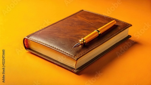 A Luxurious Leather Journal and an Elegant Amber Pen Resting on a Vibrant Orange Surface