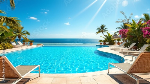 A luxurious poolside oasis with clear blue water and a view of the expansive horizon, perfect for a tranquil escape and relaxation.