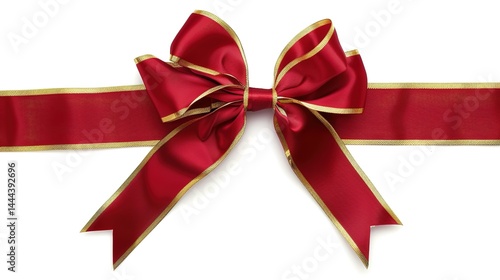 A luxurious red ribbon featuring golden edges stands out strikingly against a pristine white background, presenting an ideal visual for luxury and decoration concepts. The red ribbon, with its smooth