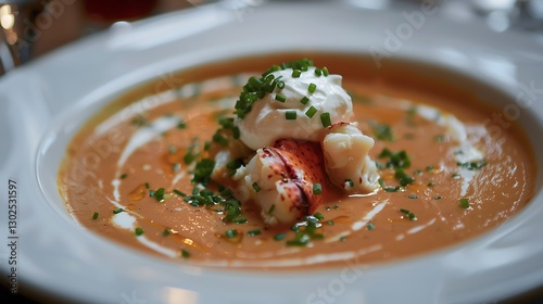 A luxurious serving of lobster bisque, garnished with a dollop of crème fraîche and a sprinkle of chives