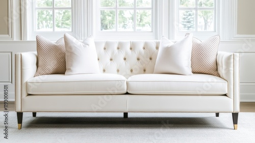 A luxurious white sofa in a stylish living room with clean lines and metallic decor accents.