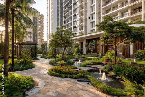 A luxury condominium tower surrounded by landscaped gardens Pathways and fountains create a serene space The mood feels tranquil and exclusive