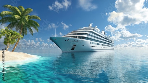 A luxury cruise ship sailing past a tropical island, with elegant design reflecting wealth and extravagance. No people.