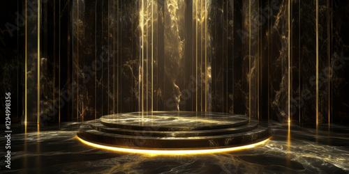 luxury, inspired, three-dimensional, background, grand, circular, dais, made, polished, onyx, surrounded, cascading, gold, light, deep, contrast, dark, texture, shimmering, highlight, exclusivity, elegance, ideal, premium, branding