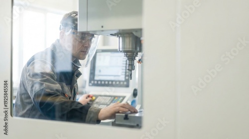 A machine operator wearing a protective face shield programs a CNC milling machine in a modern manufacturing plant.