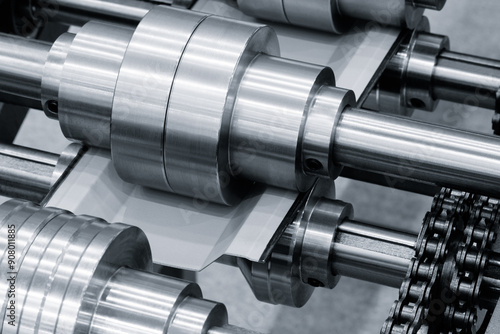 A machine with a chain and gears is being used to make a product. Concept of precision and efficiency, as the machine is designed to create a product with accuracy and speed. The use of metal