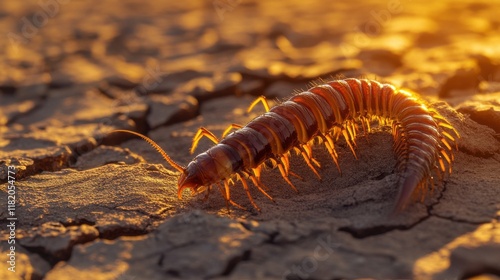 A macro shot of a centipede on dry, cracked soil, showcasing its intricate exoskeleton and vibrant orange-brown coloration under natural sunlight.