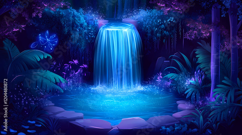 A magical forest glowing with bioluminescent plants and creatures, with a serene waterfall cascading into a shimmering pool surrounded by mystical energy. Shimmering Waterfall. Illustration