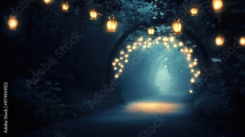 pathway, lantern, forest, magical, illuminated, glow, create, enchant, atmosphere, serene, peaceful, nature, foliage, twilight, landscape, wander, beauty, journey, colours, archway, wonder, shadow, entrance, ambience