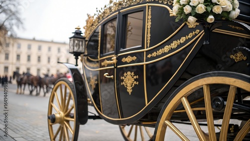 magnificent, black, gold, ornate, carriage, gold, wheel, paved, street, beautiful, adorned, fresh, white, rose, intricate, detailing, racked, transport, vehicle, luxury, elegant, royals, historic, vintage, traditional, classic, elaborate, design, pattern, floral, flower, bloom, decoration, embellishment, metallic, dark, bright, shiny, gleaming, spoke, lamp, lantern, window, door, panel, ground, road, urban