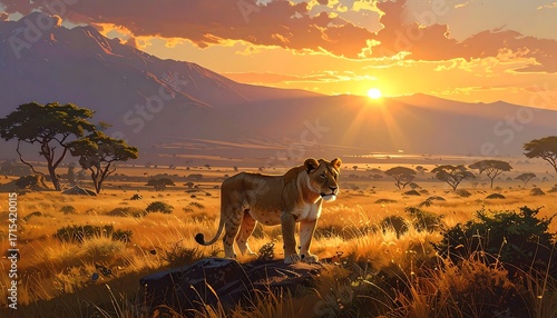 lion, savanna, sunset, landscape, mountain, gold, warm, nature, animal, africa, wildlife, tree, acacia, horizon, sun, light, brown, yellow, orange, desert, big, mammal, mammal, grass, scene, scenic, view, photorealistic, art, illustration, painting, beautiful, colourful, bright, creative, modern, elegant, stylish, professional, decorative, vibrant, stunning, amazing, marvellously, fantastic
