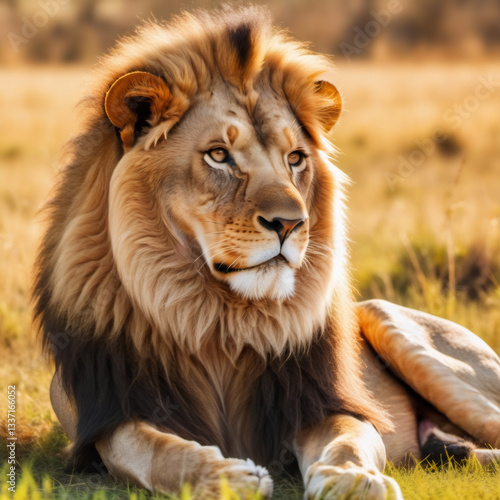 A magnificent male lion, the king of the wild jungles of Africa, lies on the grass. A majestic animal in the wild. The image shows his powerful jaw and piercing gaze