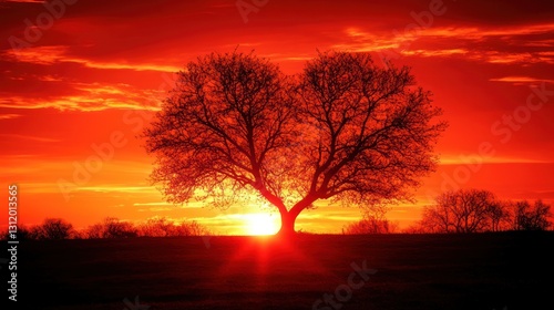 sky, sunset, tree, silhouette, nature, landscape, horizon, cloud, red, orange, light, branch, sun, twilight, warmth, calm, peaceful, serene, beauty, scenic, dramatic, high-coloured, vibrant, colours, outdoors, field, environment, evening, dawn, glow, flare, background, earth, day, season, majestic, natural, brilliant, radiant, shape, detail, composition, picturesque, beautiful, rural, calmness