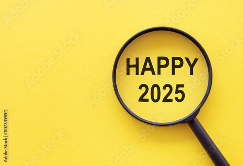 A magnifying glass highlights the message of happiness for the upcoming New Year 2025 against a vibrant yellow background.
