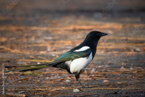 A magpie stands on the ground with dry leaves perpendicular to the camera lens on a sunny autumn day.