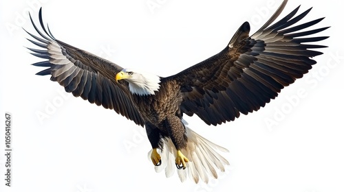 A majestic bald eagle with wings fully extended in flight, isolated on a white background