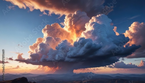 A majestic blue and orange sky with fluffy white clouds, beautiful sky, white clouds, orange sky