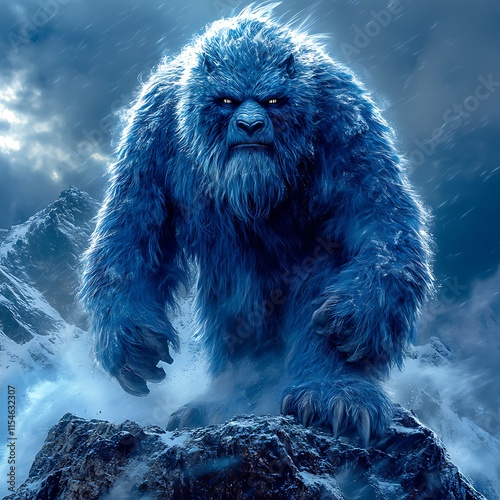 A majestic blue yeti stands on a snow-covered mountain peak amidst a blizzard.