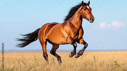 A majestic brown horse gallops across a golden field under a clear blue sky, showcasing strength and grace in motion.