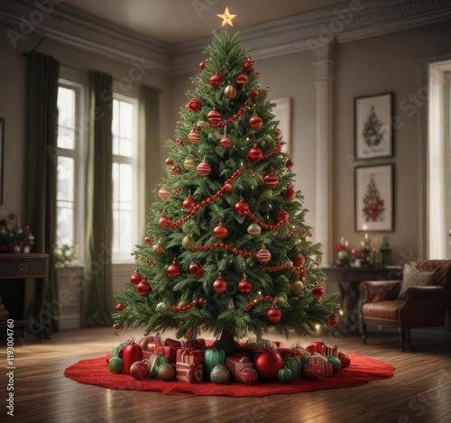 A majestic Christmas tree with red and green ornaments, evergreen tree, xmas tree, seasonal decor