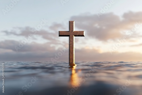 A majestic cross rises from an endless ocean, glowing with warm golden light. Soft reflections shimmer on the water, creating a serene and profound atmosphere, evoking spirituality