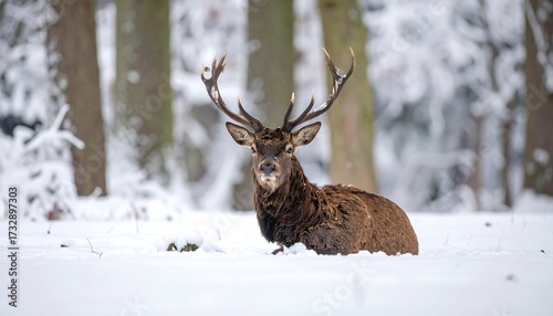 A majestic deer with impressive antlers rests serenely in a snowy woodland scene, gazing directly at the viewer