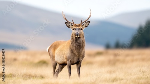 A majestic deer with large antlers standing in a golden field, mountainous landscape in the background, and serene and natural setting.
