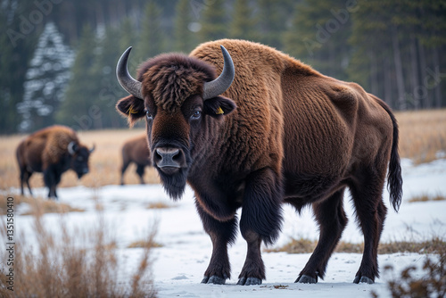 bison, winter, snow, forest, landscape, wildlife, mammal, animal, nature, outdoors, cold, majestic, powerful, strong, herd, family, background, blurred, serene, wild, beauty, fur, brown, dark, white, natural light, photo, fauna