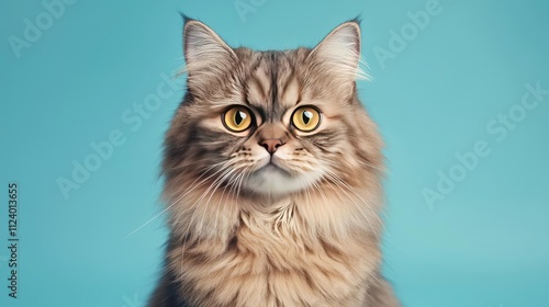 A majestic feline with striking yellow eyes against a vibrant blue background.