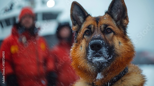 A majestic German shepherd braves the snowstorm, illustrating loyalty and courage alongside rescue team members in the background