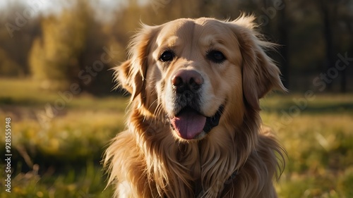 A majestic golden retriever with a flowing coat of fur, basking in the warm sunlight of a spring day.