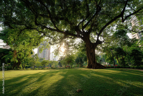 A majestic large tree stands proudly in an open park, creating long shadows as the sun sets behind urban skyscrapers, blending nature and city