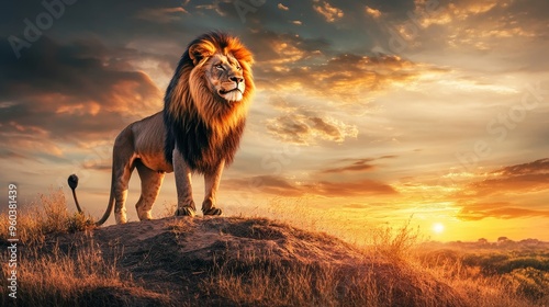 A majestic lion stands on a rock during sunset, showcasing its strength and beauty in a serene landscape.