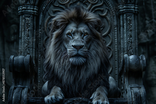 A majestic lion, with a dark mane and piercing eyes, sits on a stone throne, conveying power and authority