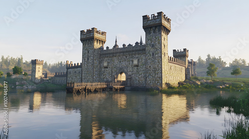 A Majestic Medieval Castle Surrounded by a Calm Moat with Towers and a Wooden Drawbridge in Golden Sunlight