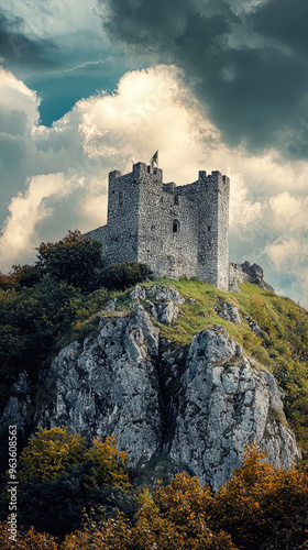 A majestic medieval stone castle perched on a hilltop, with dramatic clouds overhead and a sense of historical grandeur.