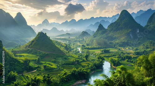 breathtaking, mountain, landscape, towering, peak, lush, green, vale, crystal-clear, river, running, scene, light, setting, sun, warm, gold, glow, highlighting, beauty, natural, earth, scenery, nature, majestic, serene, picturesque, tranquil, flowing, water, sunlight, shadow, vista, panoramic, environment, grandeur, element, earth, sky