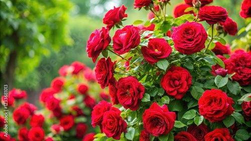 A majestic red rose bush with an abundance of vibrant, full-bloomed flowers and lush green foliage surrounding the base of the plant , botanical image, greenery