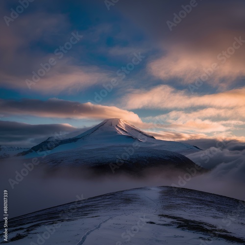 A majestic snow-capped mountain bathed in the soft light of sunrise, surrounded by misty clouds. This breathtaking scene captures the serene beauty of winter landscapes,