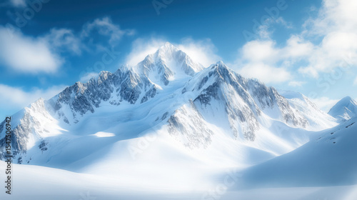 a majestic snow-covered mountain peak glowing under the morning sun with a vibrant clear blue sky in the background