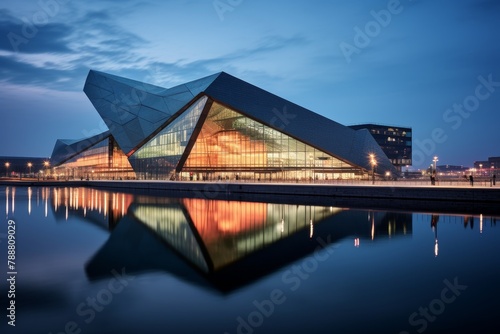 A Majestic View of a Modern Convention Center Illuminated at Dusk, Reflecting on the Nearby Water Body