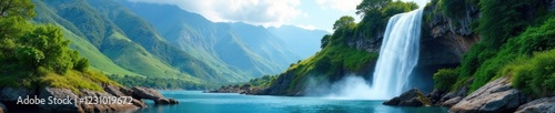 A majestic waterfall cascading down a rocky cliff amidst the surrounding mountains, calm, serenity