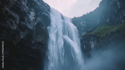 A majestic waterfall cascading down rocky cliffs, surrounded by mist and lush greenery.