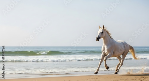 A majestic white horse gallops gracefully along a sunlit sandy beach with the vast ocean and gentle waves in the background.