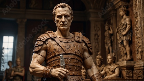 A majestic wooden carving of Julius Caesar, depicted in full Roman armor with a laurel wreath and holding a sword, surrounded by Roman soldiers and the Roman Empire's symbols.