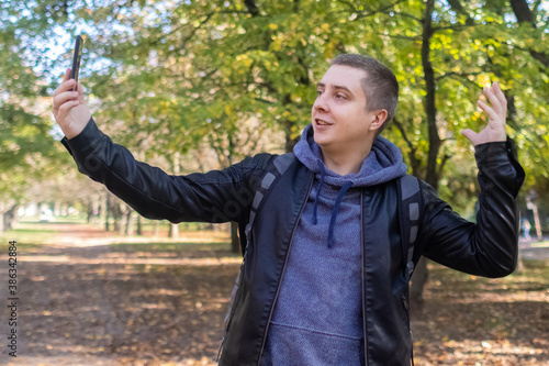A male blogger in a leather jacket in the forest conducts a video conference for his audience. The concept of online learning, master classroom and video blogging.