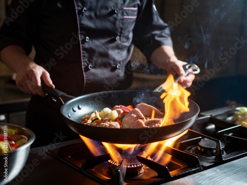 chef, cooking, flames, vegetable, meat, stir fry, kitchen, cookery, preparation, frying, food, profession, pan, fire, delicious, epicure, ingredient, eatery, heat, dinner, culinary, skill, action, gas-stove, high temperature, colourful, fresh, intense, sizzle, kitchen utensile, professional, dynamic, sharpened, artistic, artist