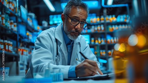 A male doctor wearing a white coat and stethoscope sits at a desk in a modern laboratory, writing on a clipboard.