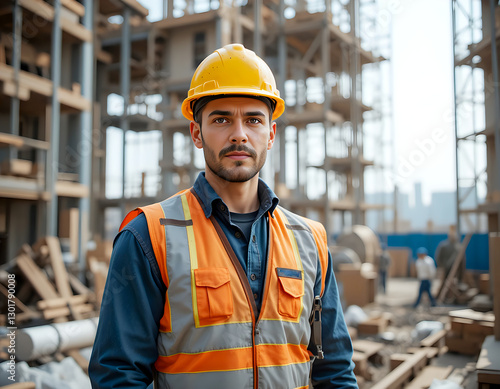 A male laborer in hard hat and safety gear at a construction site, with a blurred background showcasing scaffolding, machinery, and tools