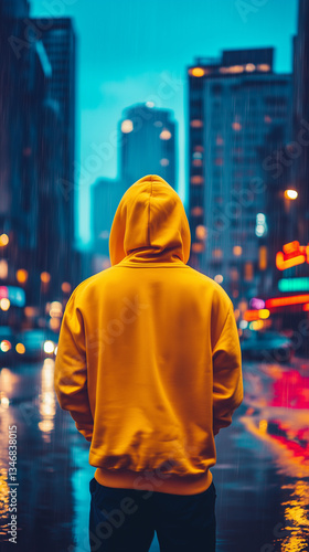 A male model wearing a yellow hoodie jacket back view, standing in the middle of a city street with neon lights and tall buildings in the distance, ai generated images.